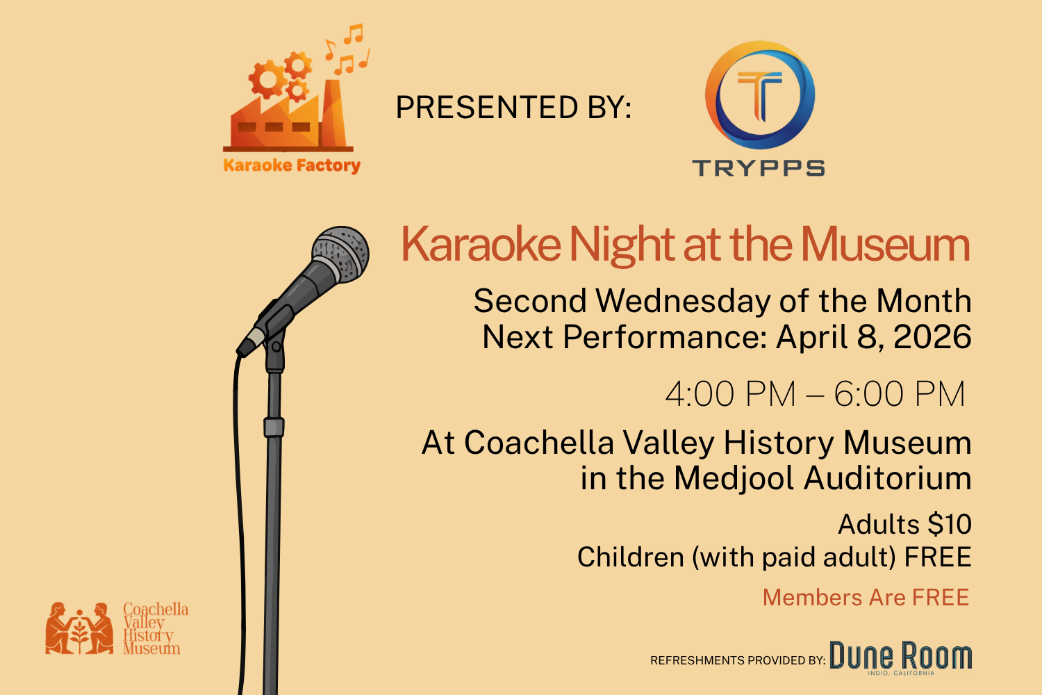 Enjoy a lively evening of music and fun at Karaoke Factory, hosted by Mike of Trypps and Ron of The Dune Room. Sing your favorite songs in a relaxed, welcoming atmosphere—perfect for all ages. RSVP required.